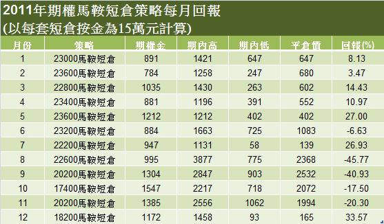 由2011年1月至12月計,假設投資者於每個期指結算最後交易日時沽出一套下月等價恒指 期權馬鞍式長倉,至下一個最後交易日以結算價平倉,其投資回報見【附表】。由1月至12月份,短倉於1月至5月,7月及12月皆錄得盈利,平均回報為17.79%,其餘月份中6月虧損較輕,8月至11月則虧損較嚴重,平均損失為26.23%。