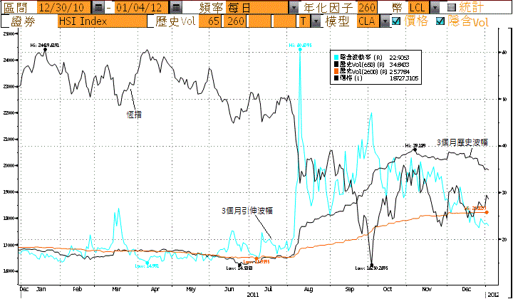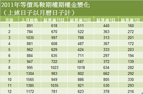 由附表所見,2011年首兩季波幅變化其實不大,第三季波幅開始大增至年底,股市8月至10月期間股災式下跌,波幅跟隨抽上,後大市急反彈至11月初後牛皮至年尾,波幅亦告逐漸回落。12月月底收市時(即 12 月 29 日),等價期權收市時的認購及認沽期權金總和達 1025點,對期權短倉策略來說,投入資金/回報比例僅合格。